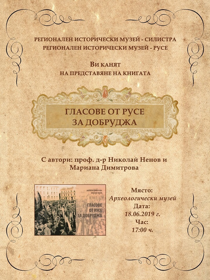 Регионален исторически музей Русе представи в залата на Археологическата експозиция на РИМ Силистра своето най-ново издание, наречено „Гласове от Русе за Добруджа“. Става дума за книга албум с автори проф. д-р Николай Ненов – директор на музея в най-големия български дунавски град, и неговата колежка Мариана Димитрова, която участва в поднасянето на най-полезната информация за творбата пред аудиторията в Силистра.Поздравления за авторите поднесоха Стоян Бонев - заместник-областен управител, и Цветана Игнатова - директор на дирекция в Общинска администрация Силистра.